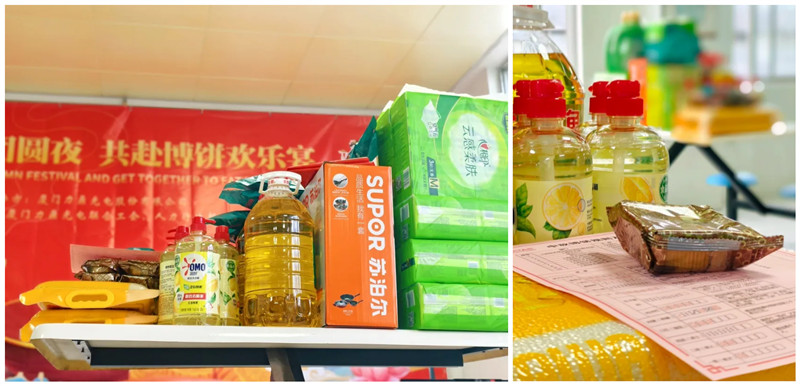 活动开始前,工会与行政部的同事已早早到岗,忙着布置博饼礼品。桌上的礼物分好类别、摆得规整,品类更是丰富 —— 既有日常能派上用场的实用好物,也有印着中秋心意的纪念月饼。